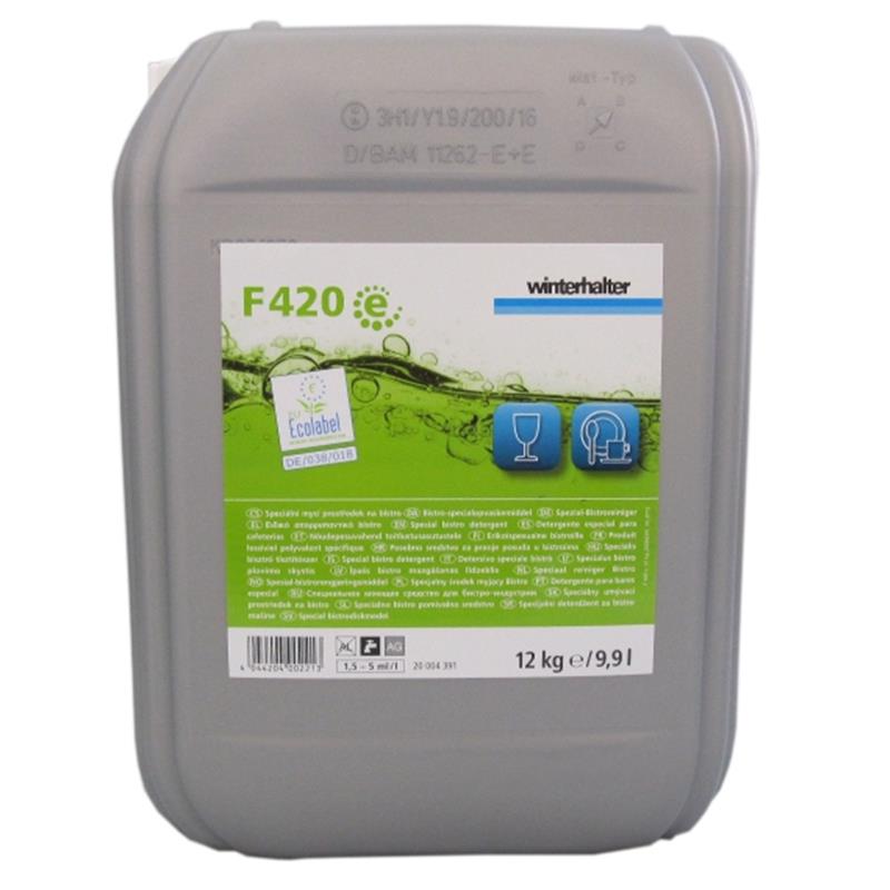 Pomivalno sredstvo za pomivanje steklovine – kozarcev in bele posode F 420 e (12 kg) je tekoče, alkalno pomivalno sredstvo za kozarce in belo posodo – okolju prijazno (primerno za trdo vodo).